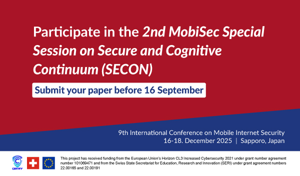 On behalf of the Certify Project, the AIR Institute is pleased to invite you to participate in the 2nd Special Session on Secure and Cognitive Continuum (SECON), which will be held as part of the 9th International Conference on Mobile Internet Security (MobiSec´25) from 16 to 18 December.