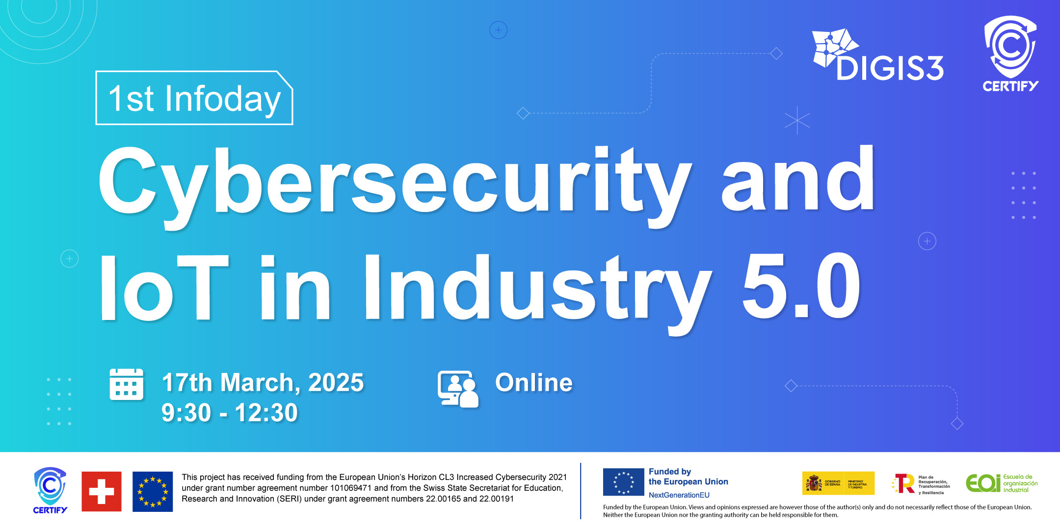 Under the title "Cybersecurity and IoT in Industry 5.0", the infoday will be a three-hour session presenting the three use cases in which Certify is currently involved: