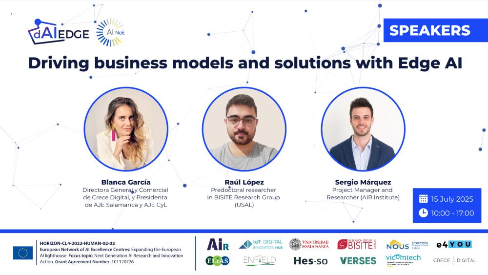 Tomorrow, one of the key events in the field of artificial intelligence and edge computing in Europe will take place in Salamanca: ‘Driving business models and solutions with Edge AI’, organised by the dAIEDGE project, in which we are actively involved. This hybrid event (you can attend in person at the R&D&I Building of the University of Salamanca) will bring together leading researchers and professionals to explore Edge AI in depth, as well as the opportunities offered by dAIEDGE through its open calls, where you can win up to €60,000