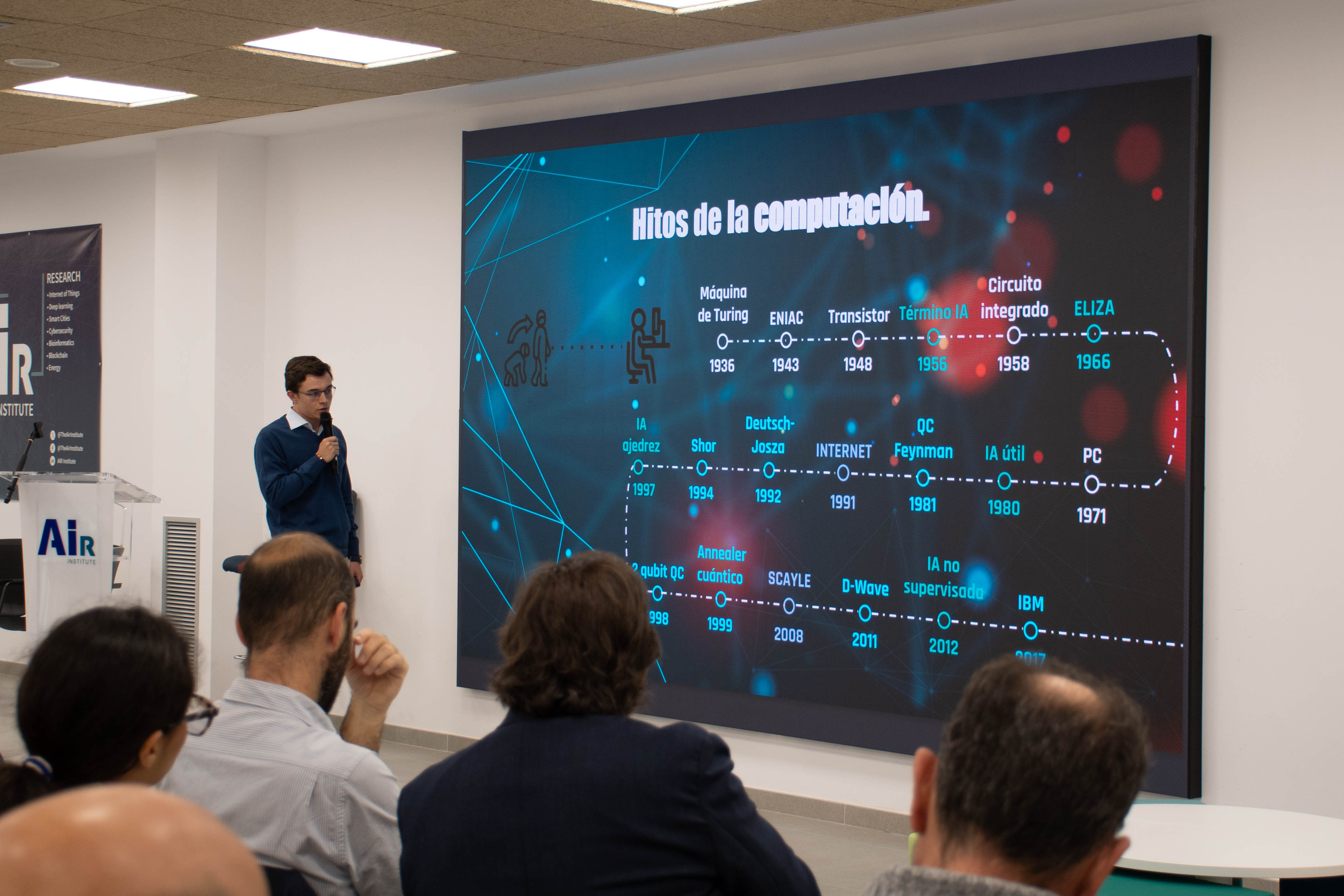 The analysis of financial problems requires the use of a large amount of data, which is why, in the era of Big Data, traditional computational methods are often insufficient to obtain results in the desired time. This was explained by Guillermo Rivas, who recently joined the AIR Institute and gave the lecture "Quantum Technology for Finance". In his presentation, the young specialist in Theoretical Physics pointed towards the potential solutions offered by quantum computing, especially when its potential is combined with that of artificial intelligence. Guillermo analyzed specific quantum technology solutions available today, as well as their prospects in the medium and long term. "Financial problems are complex because they depend on the human being's free will, and that is why quantum computing is needed," said Guillermo Rivas.