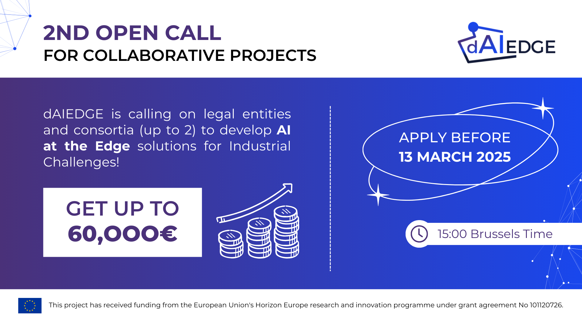 To support your proposal submission, dAIEDGE will host two informative webinars on 30 January and 27 February. These sessions will address your questions, provide practical tips, and share recommendations to maximise your application’s potential.