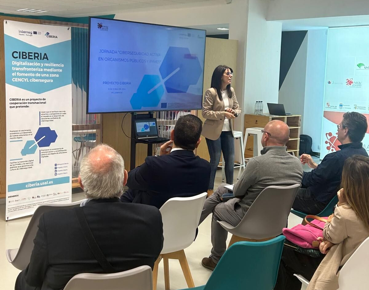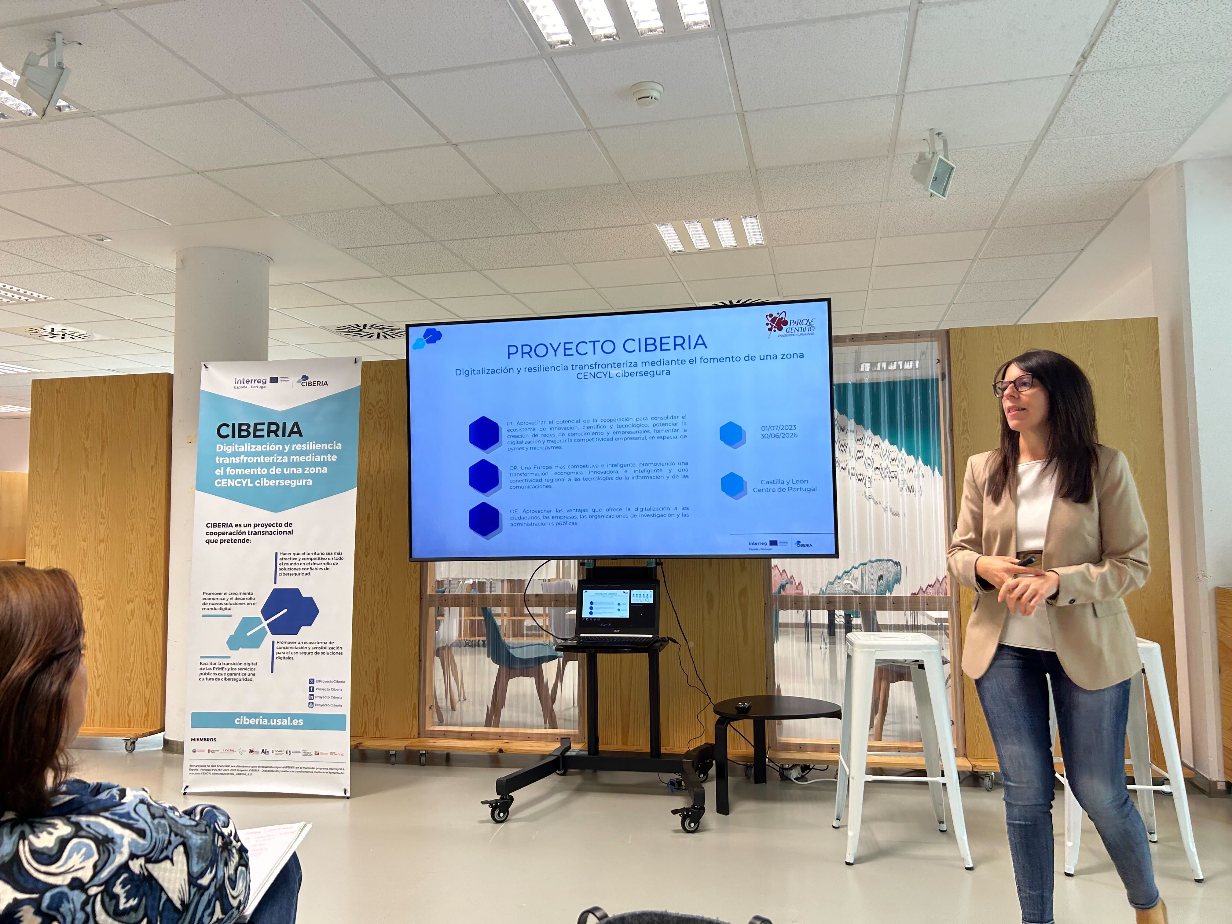 The event began at 10:45 am with the presentation of the CIBERIA Project by Teresa Jiménez Cabaco, Manager of the USAL Science Park. Her presentation, entitled "digitalisation and cross-border resilience through the promotion of a cybersecure CENCYL area", highlighted the objectives and progress of the project.