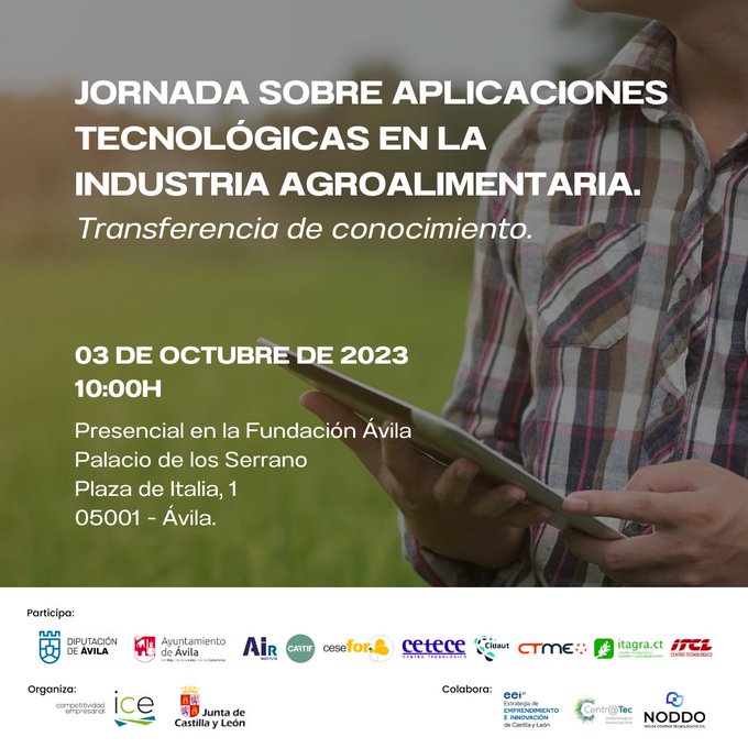 AIR Institute participated today in the conference "Technological Applications in the Agri-Food Industry", an event held at the Fundación Ávila and organized by the Junta of Castilla y León and ICE, with the collaboration of the Centr@tec Program and the Network of Technological Centers of Castilla y León (NODDO).