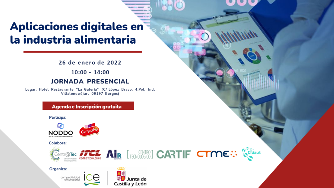 The Institute for Business Competitiveness of Castilla y León (ICE) is organizing a conference on "Digital Applications in the Food Industry" as part of the Centr@tec program, in collaboration with AIR Insitute, CARTIF, the Technological Institute of Castilla y León (ITCL), Cidaut and the Miranda del Ebro Technology Center Foundation (CTME). The event will take place on 26 January in Burgos and will be attended by leading companies in the sector and technology centers who will present innovative solutions to boost the digital transformation of the industry.